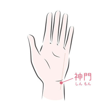 ツボの場所:手首のつけ根にある横ジワと、小指から手首に下した線が交わるあたり。