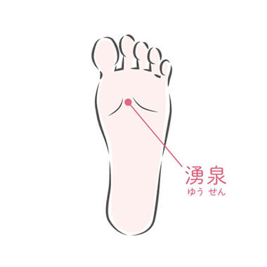 押し方:両手の親指を重ねてあて、グッと押したあとに足先のほうに突き上げるようにする。湧泉を押した後に親指の腹を使って足裏をもみほぐし、血行を促すのもよい。