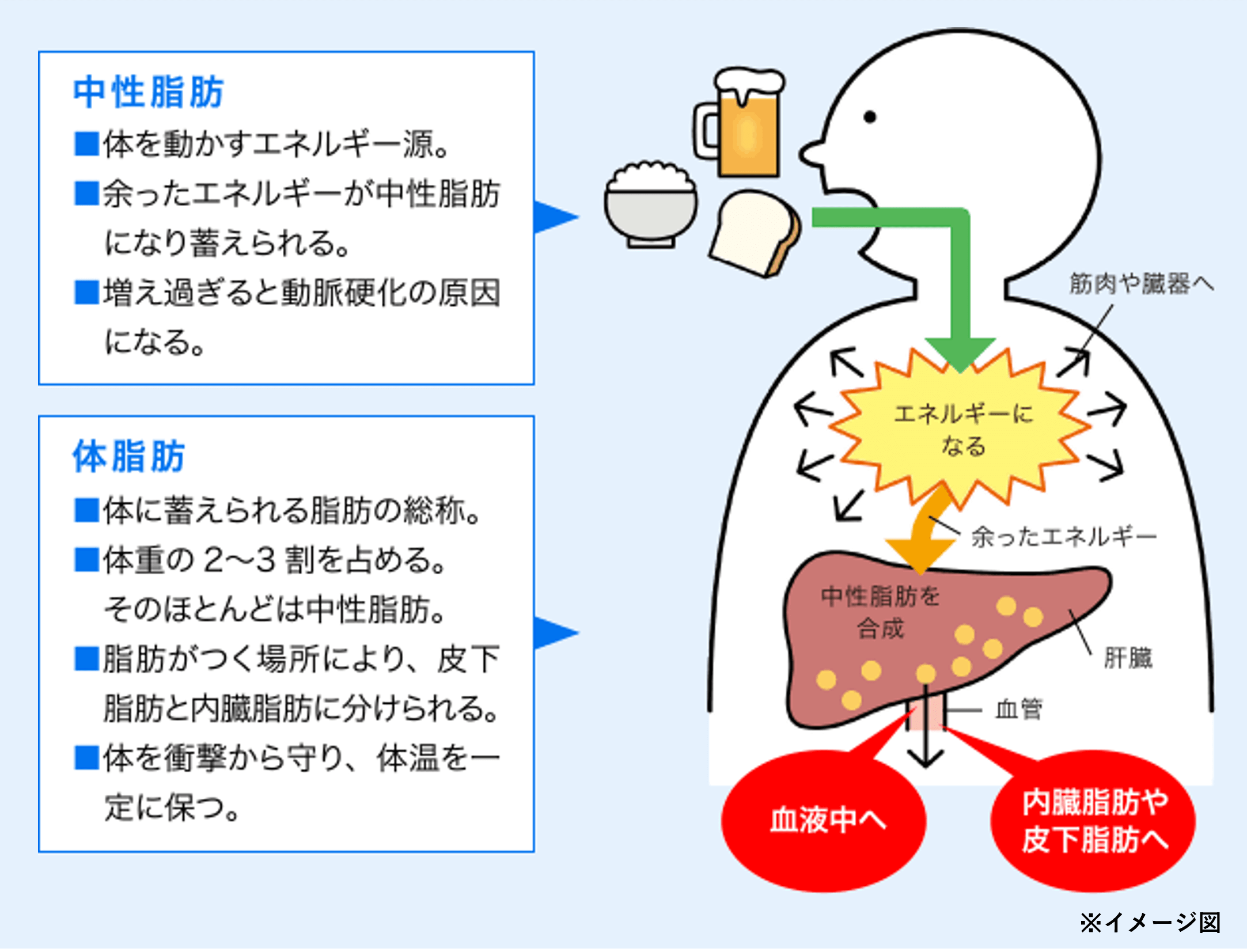 私たちが食事で摂ったエネルギーが消費されずに余ると、肝臓で「中性脂肪」が合成されます。この中性脂肪は血液中を流れて、「体脂肪」を構成する脂肪細胞(白色脂肪細胞)の中に蓄えられていきます。